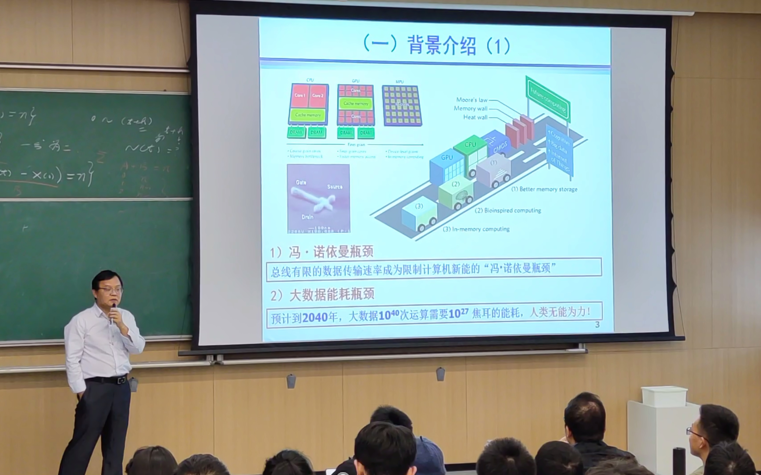 赵晓龙老师介绍完毕之后,与会师生对万青教授的个人履历及研究方向有了基本的认识,在大家的热烈掌声中,万青教授开始了他的报告。报告主要介绍了人脑是由多达1015的突触(Synapses)连接起来的一台功耗仅为20W的生物智能计算机。神经元(Neurons)是大脑记忆和信息处理的基本单元,突触则是神经元之间在功能上发生联系的部位,也是信息传递和处理的关键部位。研制具有突触/神经元功能的新概念器件对 “类脑芯片”与“类脑计算”意义十分重大。本报告从当前半导体/信息技术现状、忆阻器/类脑芯片研究历史和现状、课题组代表研究成果等多方面展开介绍。此外,基于前期工作的基础,万青教授还向大家分享了对“类脑芯片”与“类脑计算”等未来发展方向的一些思考。