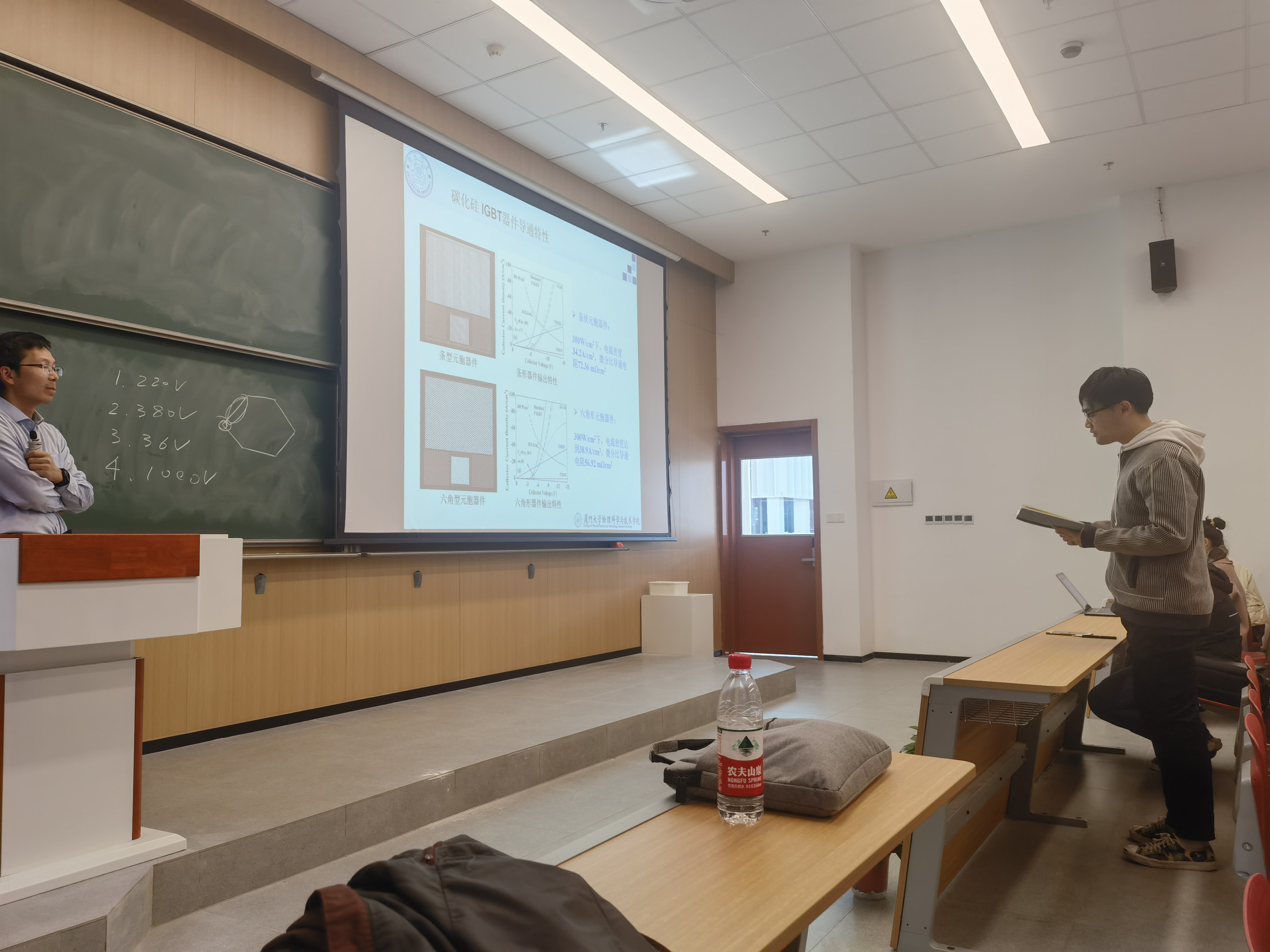 2021年11月23日,厦门大学的张峰教授,受邀在中科大高新区GT-B111教室为学校师生作了题为“宽禁带半导体SiC功率器件研究进展及应用”的学术报告。本次报告属于研究生高水平学术前沿讲座,由微电子学院徐光伟老师主持。讲座正式开始于上午10点,首先徐光伟老师对张峰教授做了简短的介绍:张峰,厦门大学物理科学与技术学院特聘教授、博士生导师、国家青年“973”计划首席科学家。2008年在厦门大学物理系获得博士学位,从事宽禁带半导体SiC材料与器件研究工作并取得系统性研究成果:率先研制10kV p沟道SiC IGBT器件,成功研制工业化1200V/60 mΩ和80 mΩ SiC MOSFET功率器件。国际上率先将1200V SiC肖特基二极管其应用到电动汽车充电桩中。同时,围绕宽禁带半导体光电探测器及单光子探测器的基本科学问题,研究提高探测器量子效率的物理机理与规律。先后获中国科学院青年创新促进会优秀会员、第三代半导体卓越创新青年、福建省杰出青年科学基金等奖励和荣誉。现任中国材料研究学会青年工作委员会理事、中国电子学会高级会员、中国电机工程学会电力电子器件专业委员会委员;以及学术期刊Journal of Semiconductors编委,IEEE Journal of Emerging and Selected Topics in Power Electronics客座编委等职务。