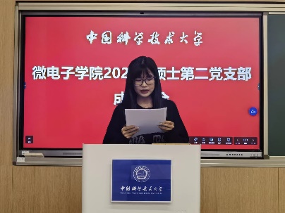 会议在庄严的国歌声中拉开序幕。方纪明同志宣读了关于成立中共中国科学技术大学微电子学院2022级硕士第一支部委员会的通知。王诗琪同志代表党支部党员大会筹备工作领导小组向大会报告了党员大会筹备工作情况。裴鹏翔同志宣读了党支部委员会选举办法(草案),提出了委员候选人名单、监票人名单、计票人名单,经举手表决,与会党员一致通过本次选举办法和相关名单。