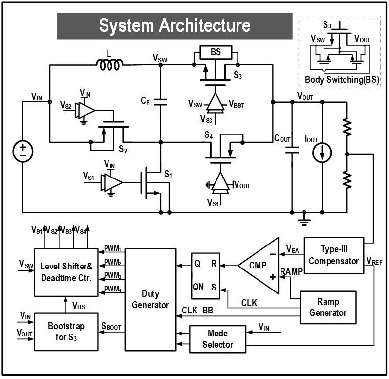 Buck-Boost转换器广泛应用于锂电池供电的移动电子设备中,将在实际使用时变化的电池电压(2.7 V-4.2 V) 转换为3.4V左右的固定电压,为应用端如射频功放、蓝牙等模块供电。为了延长电池的使用时间,需要转换器在全电池电压范围内保持高效率。同时为了满足移动电子设备的小型化需求,要求转换器具有高电流密度。