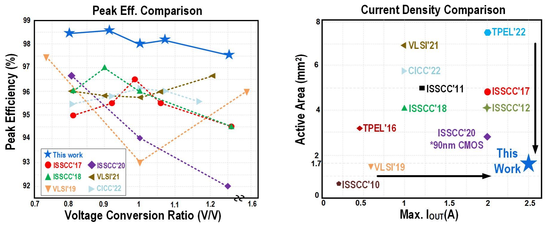 测试结果表明,该芯片可实现98.6%的峰值效率,在1.7 mm2的芯片面积下实现了最大2.5A的输出电流。与同类研究相比,本设计以最低的芯片成本取得了全电压转换比下最高效率以及最高电流密度,实现了效率与电流密度较为完美的折中。该研究成果以“A 98.6%-Peak-Efficiency 1.47A/mm2Current-Density Buck-Boost Converter with Always Reduced Conduction Loss”为题发表在ISSCC 2023上。第一作者为我校微电子学院博士生靳吉,程林教授为通讯作者,合肥乘翎微电子有限公司为论文合作单位。这也是程林教授课题组连续第三年在ISSCC上发表关于电源管理芯片设计的工作。
