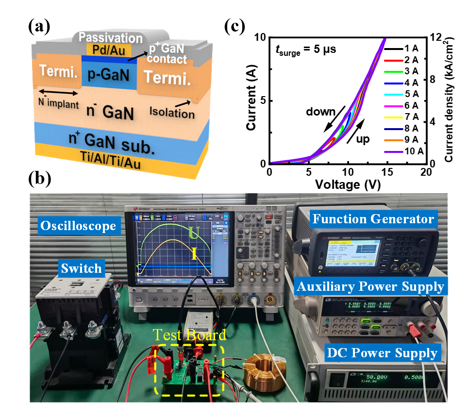 图3. (a)垂直GaN-on-GaN PiN二极管;(b)浪涌测试平台;(c)浪涌测试结果
