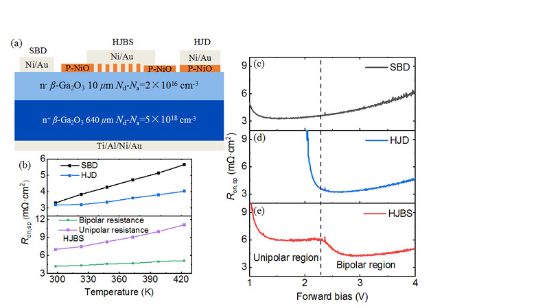 在这项工作中,通过采用p型NiO制备了具有混合单极和双极型的垂直β-Ga2O3异质结势垒肖特基二极管(HJBS),阳极边缘采用NiO薄膜用作JTE抑制电极边缘电场集聚效应,该器件结合了SBD的低正向压降和HJD的高阻断电压、低反向漏电的优点。当正向电压超过HJD的导通电压时,电流传导模式从高导通电阻的单极性模式转变为低导通电阻的双极性模式,实验结果初步证明了β-Ga2O3 HJBS中存在双极行为。研究成果以“1 kV Vertical β-Ga2O3 Heterojunction Barrier Schottky Diode with Hybrid Unipolar and Bipolar Operation”为题发表在IEEE ISPSD 2023上,第一作者为我校微电子学院博士生郝伟兵,微电子学院徐光伟特任副研究员为论文通讯作者。