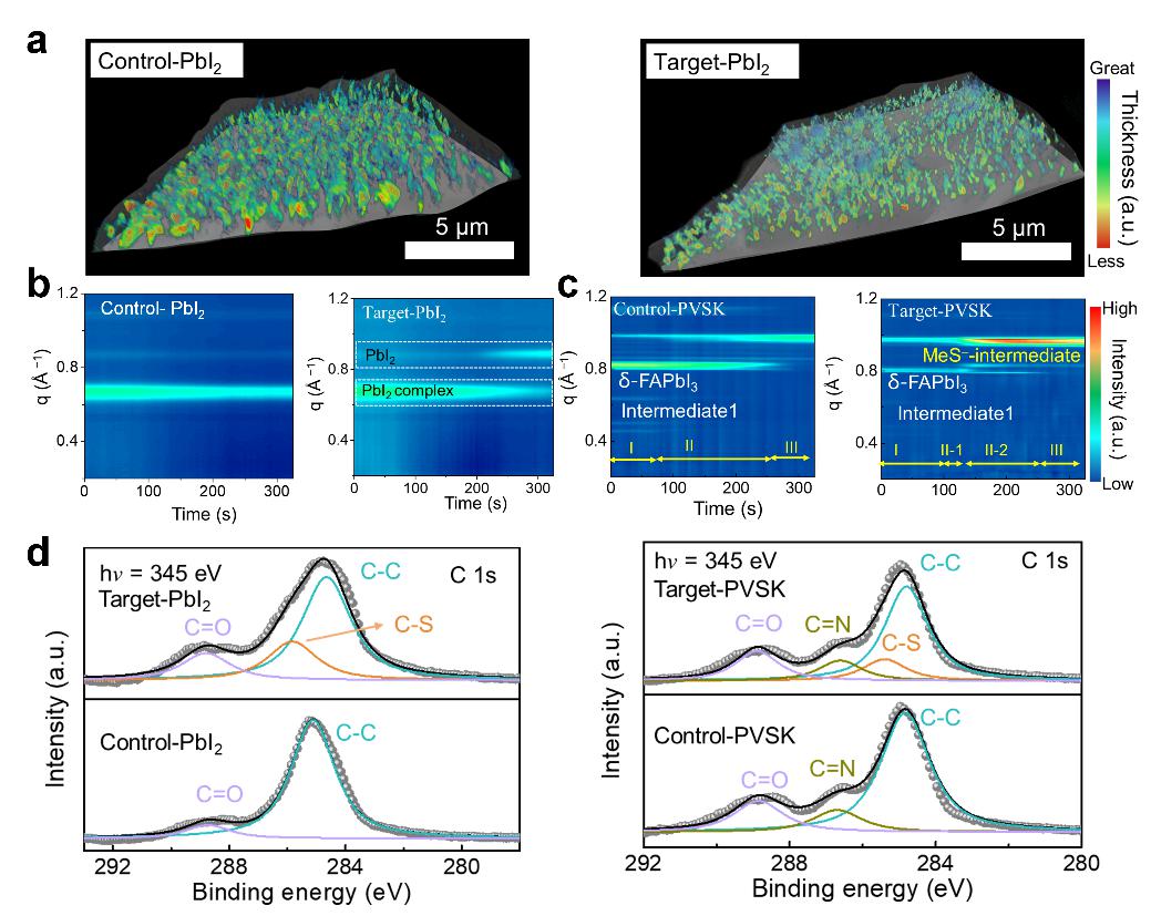 研究人员系统利用多尺度多模态的同步辐射技术,揭示了钙钛矿在催化转化过程中的化学和结构演变。在此工作中,基于同步辐射X射线的纳米计算机断层扫描(nano-CT)技术(如图2a)被首次应用于碘化铅的三维成像。利用原位掠入射广角X射线散射(GIWAXS)技术,研究人员观测到了碘化铅(如图2b)和钙钛矿(如图2c)的相演化过程,并发现了类催化剂的中间体(MeS—intermediate)。同步辐射光电子能谱(SRPES)的元素分析证明了类催化剂组分存在于最终产物中。此工作提出了一种用于调控钙钛矿半导体材料反应动力学的新型类催化系统,并构建了钙钛矿薄膜的形成-结构-特性-应用的关联性,推动了光伏器件的发展。