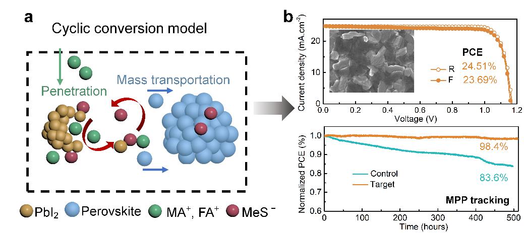 钙钛矿材料具有优异的光电性能和可调控的光学特性,在半导体领域具有广泛的应用潜力。然而,由于钙钛矿薄膜的转化反应动力学不可控,导致薄膜结构存在异质性,引发光生载流子非辐射复合和器件性能下降。为了解决这一问题,研究人员提出一种可循环的转化过程(图1a),降低了钙钛矿薄膜的异质性,并制备得到高效稳定的钙钛矿太阳能电池(图1b)。