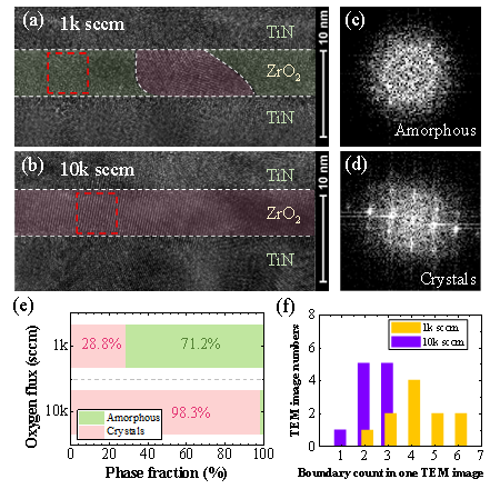 图2. 高分辨率透射电子显微镜 (HRTEM) 下6 nm ZrO2薄膜器件横截面的图像。1k (a) 和 10k (b) sccm氧通量,显示了非晶态(c,绿色区域)和结晶态(d,粉红色区域) 部分。对不同氧通量样品进行结晶程度的统计,可以看到高氧通量样品结晶程度高(e),且晶界数量较少(f)。