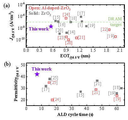 DRAM电容器介质材料等效氧化物厚度(EOT)逐步微缩,给介质生长带来了挑战。这项研究系统地控制了介电薄膜ALD生长过程中的氧化剂 (O3) 通量,发现高氧通量可以补偿短脉冲时间带来的负面影响。这种“短脉冲 - 高通氧量”方法可以实现高 k (~47)、低漏电 (2 × 10-8 A/cm2,DRAM 工作电压约为 0.5 V) 电容器的制备,有效降低了器件EOT (~0.55 nm),同时减少了 ALD 生长介质循环周期时间,提高了DRAM生产效率。与其他报道中锆基器件性能的对比见图1。