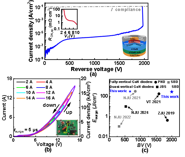图1. (a) 2 kV/0.45 mΩ·cm2双极型垂直GaN二极管正向导通与反向阻断能力; (b) 浪涌电流I-V特性; (c) GaN二极管浪涌电流能力对比。