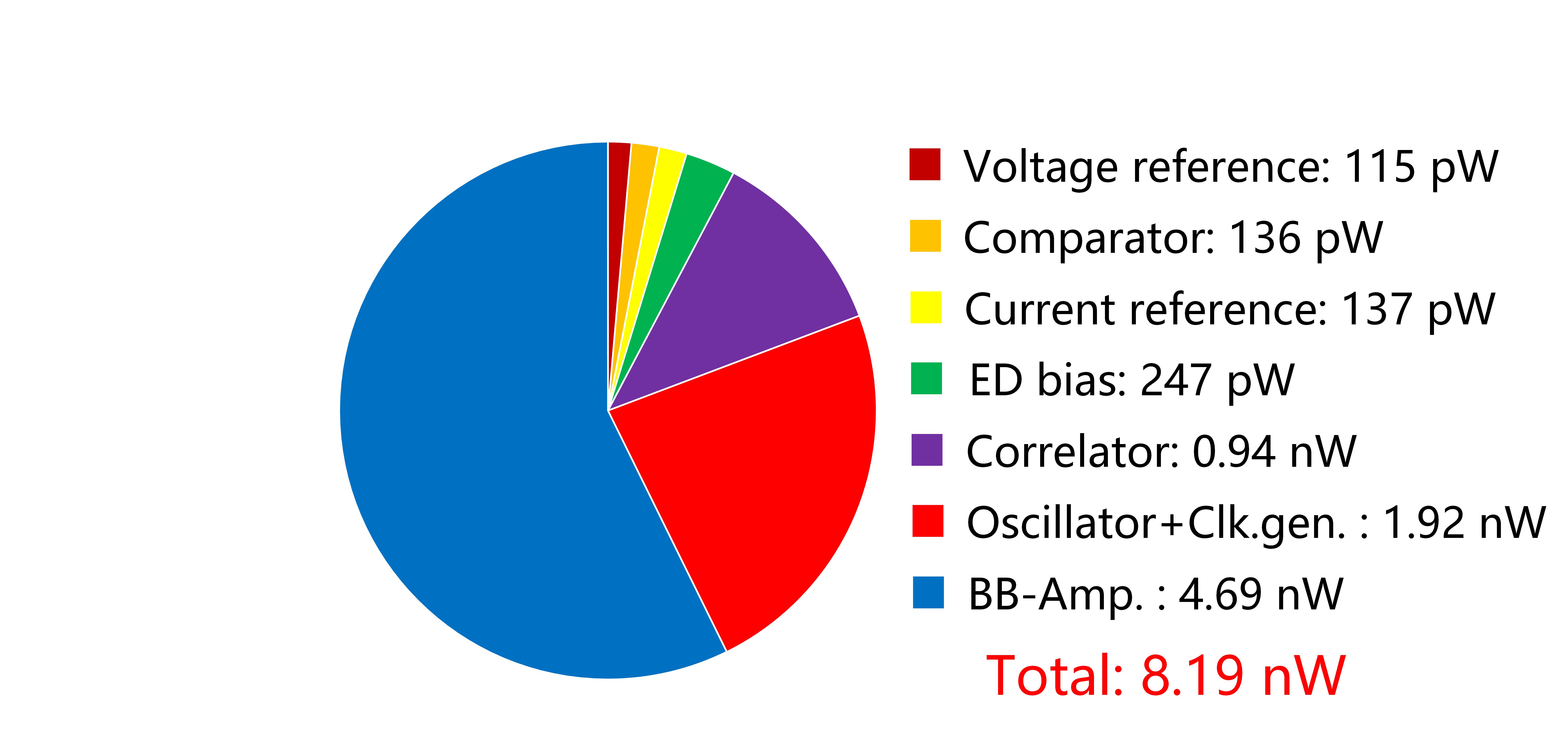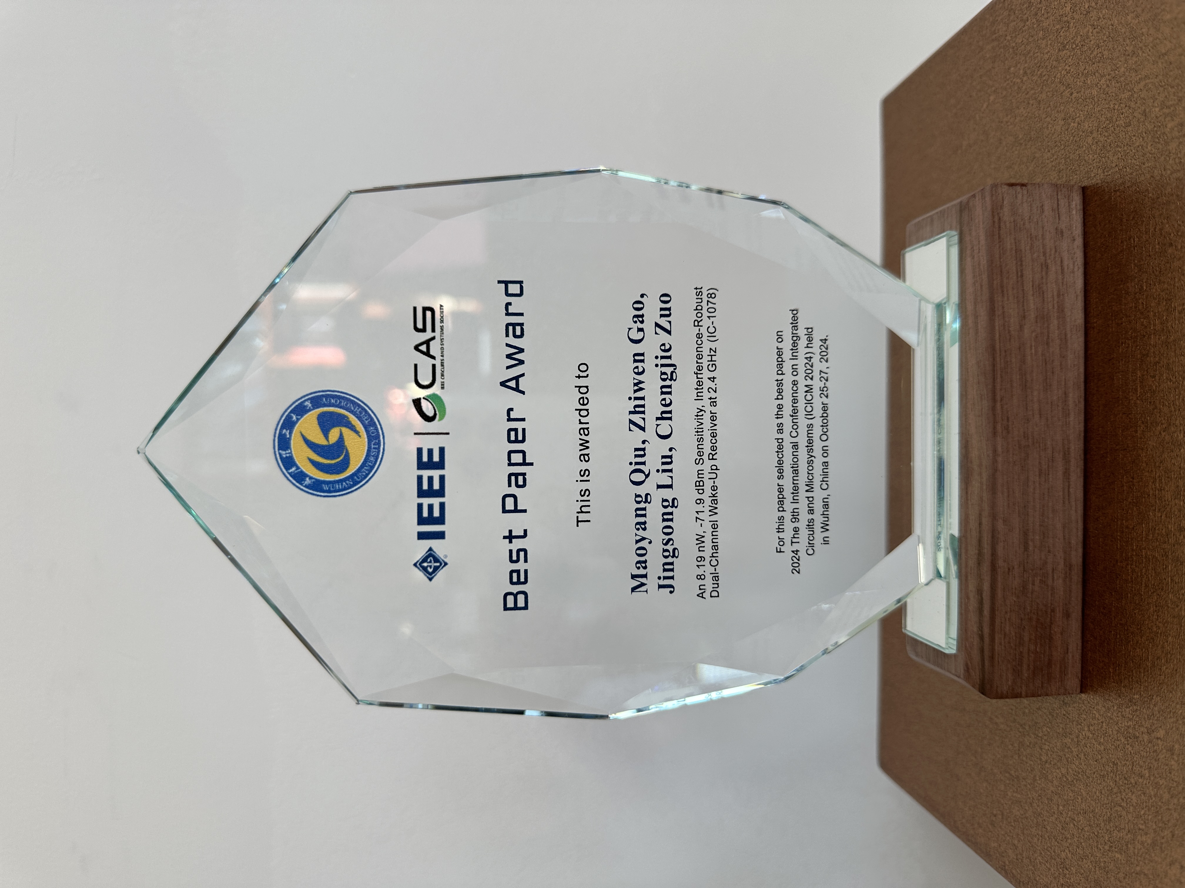 后仿真结果表明,对于250 bps OOK调制的干扰信号,该WuRX的最优带内信号干扰比(SIR)达到了-39.1 dB,在两个通道的中心频率frf1和frf2处的SIR分别为-11.5 dB和-30.6 dB,其最差的带内SIR都优于-6.4 dB,为目前nW量级WuRX中最优的;该WuRX的功耗为8.19 nW,灵敏度为-71.9 dBm,核心芯片面积仅为0.165 mm2,在已报道的研究中处于前列。该研究成果以“An 8.19 nW, -71.9 dBm Sensitivity, Interference-Robust Dual-Channel Wake-Up Receiver at 2.4 GHz”为题发表在ICICM 2024上,第一作者为我院硕士研究生邱茂洋,左成杰教授为论文的通讯作者。该成果获得了ICICM 2024的最佳论文奖以及最佳报告奖。