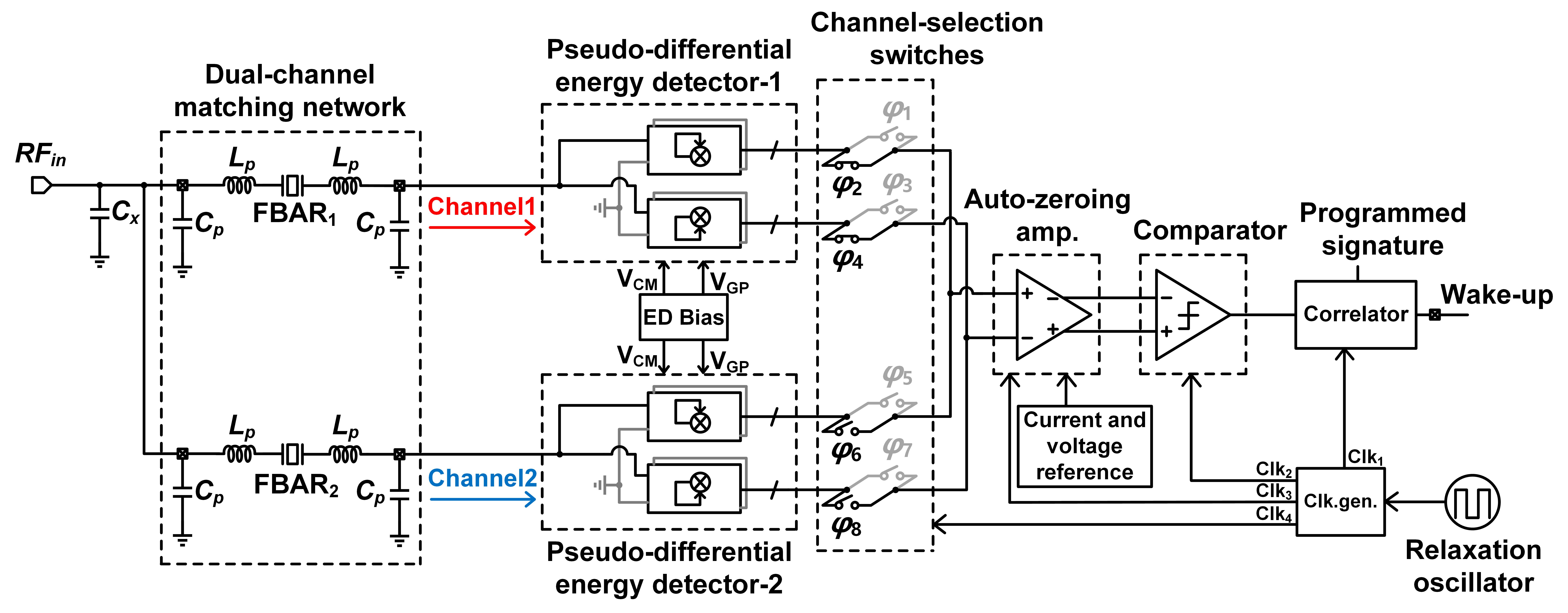 为了提升nW量级WuRX的抗干扰能力,该研究提出了一种双通道直接下变频的唤醒接收机架构(Dual-Channel ED-1st WuRX)。另外还提出了一种基于微机电系统(MEMS)谐振器的双通道匹配网络和一种特殊设计的双通道OOK调制唤醒序列,以配合基带电路实施双通道工作模式,这极大地提升了nW量级WuRX的抗干扰能力。