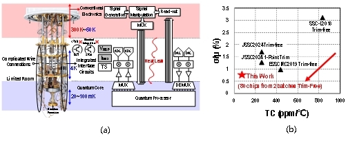 图(a) 量子接口芯片的工作环境;图(b) 温度与工艺精度相较于前沿研究展现出显著优势。