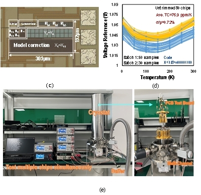 图(c)芯片显微镜照片;图(d)测试的两批次共80颗未修调芯片的温度曲线;图(e)稀释制冷机和自动计数系统的测量环境。