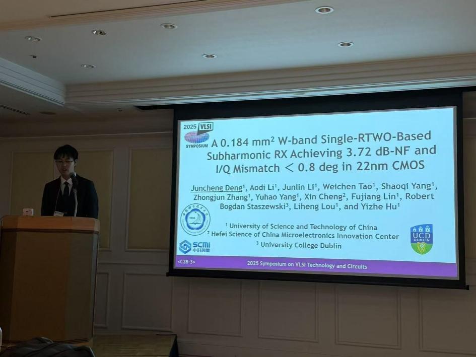 该成果以“A 0.184 mm2 W-band Single-RTWO-Based Subharmonic RX Achieving 3.72 dB-NF and I/Q Mismatch < 0.8 deg in 22nm CMOS”为题由论文第一作者、我院博士生邓俊程在大会Sub-THz TRXs专题作现场汇报,胡诣哲教授担任通讯作者。该研究工作得到了合肥中科微电子创新中心有限公司资助,同时得到了安徽省集成电路科学与技术重点实验室的大力支持。