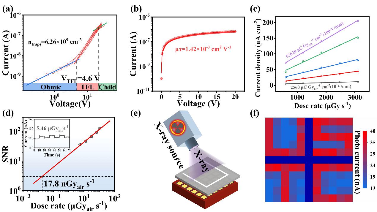 针对上述问题,本工作将研究重点聚焦于载流子输运特性和器件结构的优化上,成功实现了兼具优异性能和良好制备工艺性的X射线探测器。在载流子输运特性方面,团队凭借对晶体生长工艺的精细调控,成功获得了具备优异载流子输运性能的晶体材料,载流子迁移率-寿命乘积(μτ)达到1.42×10-3 cm2 V-1(图1b),缺陷密度低至6.26×109 cm-3(图1a)。这些特性使得探测器在X射线照射下能够更高效地收集光生载流子,从而实现更高的灵敏度和更低的检测。在器件结构设计方面,采用水平型结构,通过合理配置光吸收区域与电荷收集路径,不仅有效降低了对晶体厚度均匀性的严苛要求,极大简化了制备工艺流程,还显著增强了器件的稳定性与重复性,同时大幅提升了载流子收集效率,为探测器性能的提升奠定了坚实基础。