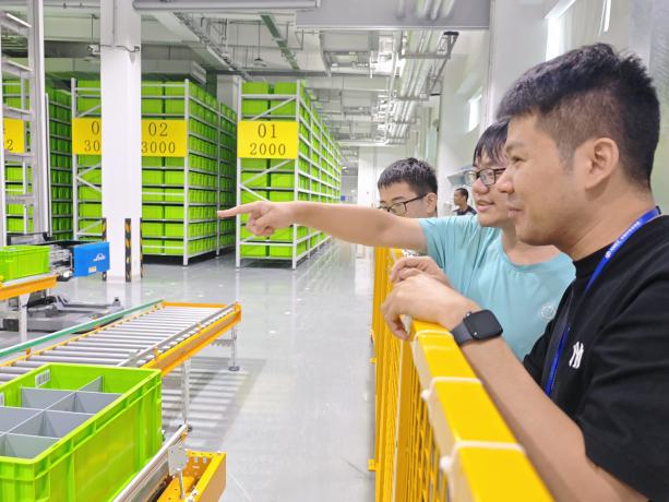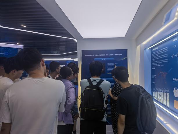 上午九点半,当夏日的阳光洒满临港产业园区时,英才班的同学们已经整齐列队在中微公司的科创展厅前。在观看完激昂澎湃的公司宣传片《科创之歌》后,一场关于“中国智造”的深度探访正式拉开帷幕。参观公司展示区时,展厅中央1:10比例的刻蚀设备模型令人印象深刻,其精密结构引发阵阵赞叹。在生产线展示区,智能化生产线让同学们大开眼界,无人搬运车正沿着预设磁轨有序穿梭,机械臂精准地进行物资传输。“这条自动化产线实现了95%的无人化操作”,生产主管介绍道,“相比传统模式,生产效率提升60%。”机器人精准配送物料的场景让同学们惊叹:“原来‘中国智造’已经达到这样的自动化水平!”