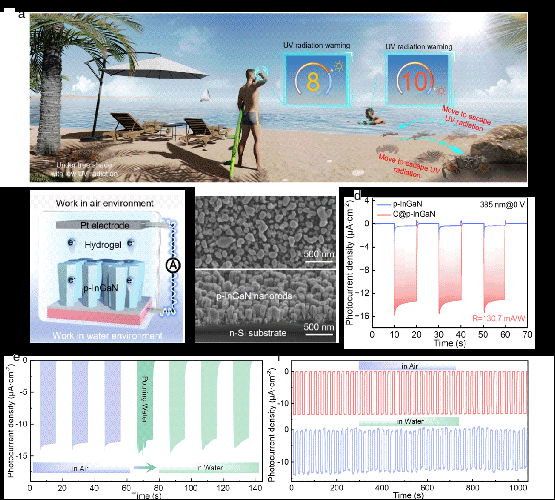 图1. 水凝胶/InGaN纳米线异质结水陆两栖光传感器的设计以及其水陆两栖光电性能的表征