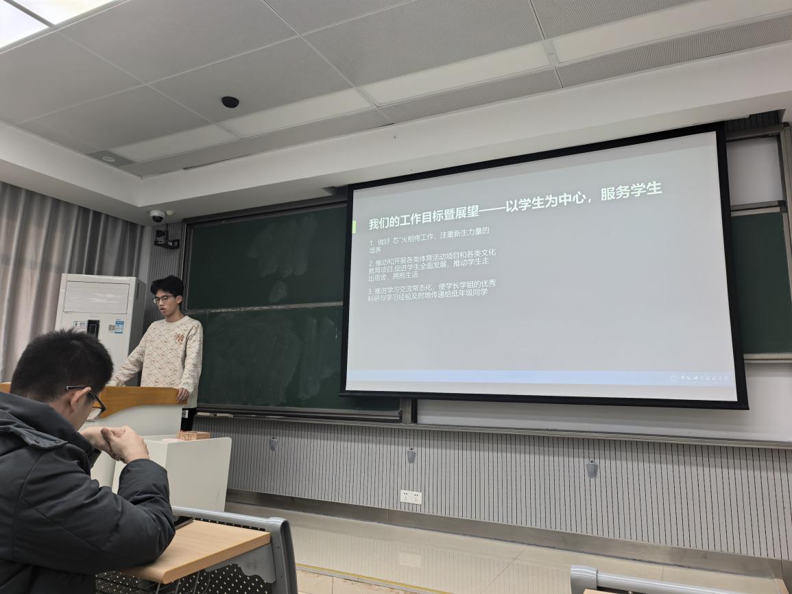 会议伊始,学生会主席团成员李俊融代表学生会作学期工作汇报。报告围绕“迎新服务”“文化教育”“体育活动”“学业帮扶”四大板块展开,全面回顾了本学期各项活动的组织与成效。在迎新服务方面,学生会精心策划了新生茶话会,通过家乡特产分享、才艺表演和破冰游戏,帮助新生快速融入集体,现场氛围温馨融洽;军训期间,学生会还为新生送上清凉解暑的西瓜,传递了学院的关怀与温暖。文化教育方面,学生会组织成员参观安徽省博物馆,深化了同学们对安徽历史文化的认知,增强了文化自信与使命感。体育活动方面,10月18日举办的“芯”动绿荫本科生足球赛在高新区足球场圆满落幕,展现了学子们的运动风采与团队精神;第56届学生运动会期间,30余名同学奋勇拼搏,学生会全程提供周到服务;12月6日开展的“12.9青年跑”活动,文体部积极动员并设立补给站,为参与者保驾护航。学业帮扶方面,学生会邀请大四学长学姐为大二同学分享科研竞赛经验,同时组织大二学长辅导大一新生课业;10月27日起,为期五周的“芯火相传”朋辈助学活动顺利开展,既助力新生适应大学生活,也提升了学长的沟通能力与责任意识,实现了共同成长。李俊融在总结中充分肯定了各部门及全体成员的辛勤付出,同时指出了工作中存在的不足,并对下一阶段工作提出了具体要求。