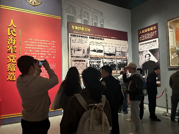 4月20日中午,本次活动全体人员顺利到达青岛,经过短暂休整后,一同前往中国海军博物馆进行参观学习。海军博物馆坐落在美丽的胶州之滨,馆藏文物共计10000余件,是中国唯一一座全面反映中国海军发展的军事博物馆。馆外微风吹拂,海鸥在不远的海面上飞翔;馆内人声鼎沸,陈列着各类展品及文物。同学们一来到馆前,便仿佛能亲手触摸到其庄严肃穆氛围下的厚重历史。进入馆内,各类展品琳琅满目,从海军的建军历史,到各类珍贵的历史文物,如各种枪炮武器、制式军装、办公生活用品等,无一不展现着海军这几十年波澜壮丽的发展历程,也反映了中国海军革命化、现代化、正规化建设的进程。同学们穿梭在展厅间,看着一件件文物,聆听着一段段激动人心的故事,仿佛走进了时光隧道,亲身感受着属于中国海军的光荣与壮丽,感受着海军官兵的无畏精神和对国家的忠诚。“通过参观海军博物馆,我深刻地感受到了祖国海军的光荣历史和强大实力,我为我们国家拥有如此强大的海上力量感到骄傲!”汪伟同学激动地表示。