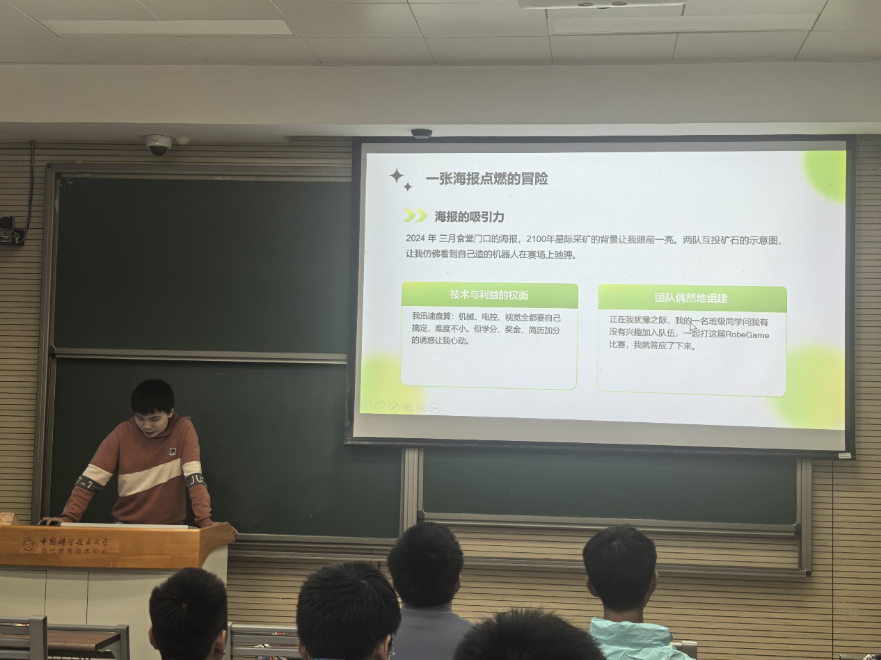 宋佳檬同学以“从参赛者到引路人:我的RoboGame24届参赛旅程”为主题,分享了与团队设计投石车项目的全过程。从被比赛海报点燃兴趣,到模块调试与整体优化,他详细讲述了参赛的每一个关键环节。宋佳檬表示,RoboGame不仅让他在成绩上有所突破,更培养了他自主学习、团队协作、动手实践和勇于创新的能力。他鼓励同学们主动联系学院老师,拓宽视野,为未来的科研道路奠定坚实基础。