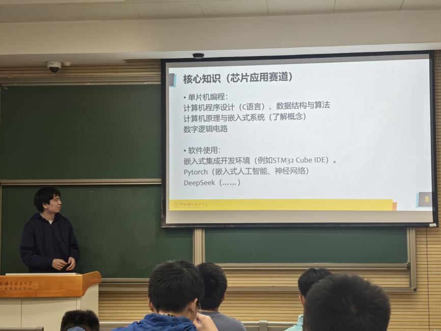 赵逸飞同学则分享了他在嵌入式芯片与系统竞赛中的经历。通过一段生动的演示视频,他展示了团队开发的肌电信号控制特技小车。该小车能够根据操作者手部动作(如握拳、翻腕)实现前进、后退或翻滚等功能。赵逸飞深入讲解了项目的核心知识和底层框架,并强调了理论与实践结合的重要性。他建议同学们充分利用校内课程资源,将课堂所学转化为实际应用,真正做到“理实交融”。