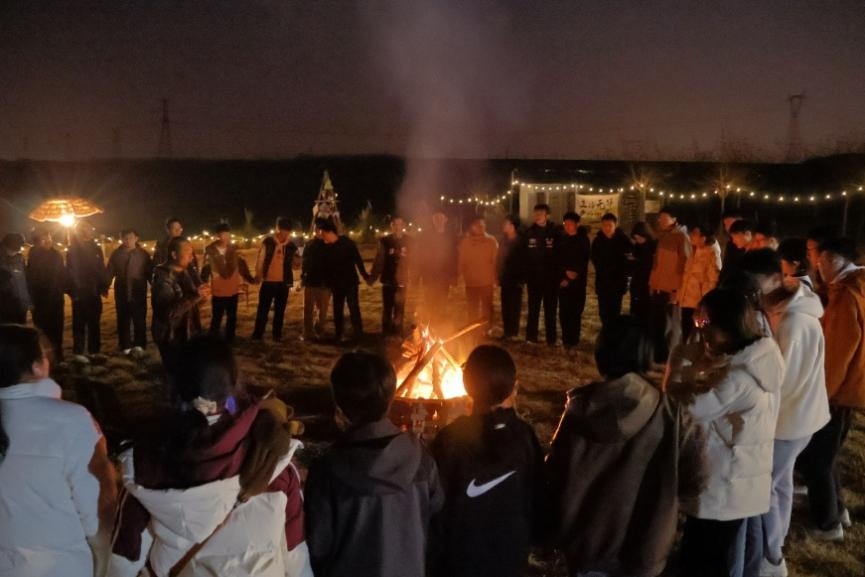 傍晚时分,烧烤炉燃起袅袅炊烟。同学们用亲手采摘的蔬菜和自己准备的食材,共同烹饪、分享美食。炊烟缭绕中,笑语欢声不绝于耳,情谊随着食物香气渐渐升腾。夜幕降临后,篝火晚会将气氛推向高潮。大家围聚在温暖的篝火旁,观赏烟花,载歌载舞,开展趣味游戏,火光映照着每一张年轻的脸庞,也照亮了彼此眼中真诚的信任与友谊。